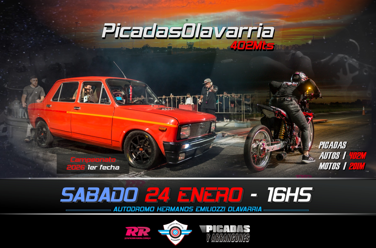 #PicadasOlavarria Nocturnas!! SABADO 24 ENERO 1er FECHA CAMPEONATO 2026!! Apertura 15.30hs MOTOS 201m & 21.30hs AUTOS 402m - Autodromo Hnos. Emiliozzi de #Olavarria